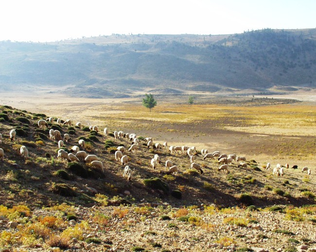 Nadránom sa chladný vzduch, ktorým zem dýcha dostane až do stanu a prebudí nás presne včas, aby sme stihli východ slnka nad jazerom. Už sa len poobzerať okolo seba a zaimprovizovať si na raňajky. Tak dnes to bude chubz a pomaranč. Ani sa mi nechcelo veriť ako sa k sebe hodia. Vydávame sa na prechádzku na kopce nad jazerom. Kedysi bolo celé okolie jazera pokryté hustým cédrovým lesom, ale tieto časy sú nenávratne preč. Dnes tu zostalo stáť niekoľko osamelých cédrov, ktorých samota pomaličky ubíja. Nejakým zázrakom prežili, aby podali svedectvo ako civilizácia ničí prírodu. Ostatné stromy ľudia sťali a použili na stavbu lodí a domov. Na začiatku stúpania sedí pokojne pastier s veľkým stádom oviec, ktoré sa mu rozutekalo po okolitom svahu. Cesta hore je tŕnitá, pretože vedie cez pole plné pichľavých rastlín. Tu by človek sandále naozaj neocenil. Všimnem si, že sem tam sa medzi hŕbou kamenia objavia malé skameneliny. Oblasť stredného Atlasu je na ne obzvlášť bohatá. Dvíhame niekoľko kameňov a pod nimi sa k vlhkej zemi krčia škorpióny. Pomaličky sa rozbehli hľadať si iný ukrýt. Hore z kopca je nádherný pohľad na jazero a krajinu do ktorej je zasadené. Odtiaľto vyzerá menšie ako keď človek stojí na jeho brehu, ale to len preto, že je práve obdobie sucha a jeho koryto pozvoľna vysychá.